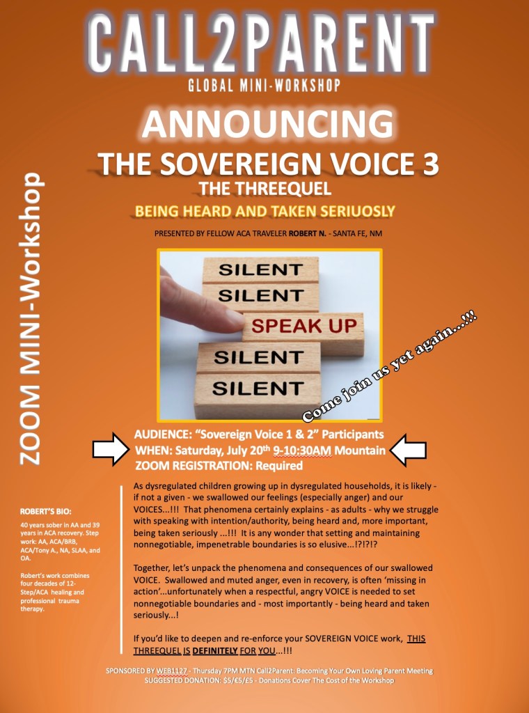 There is even more work to do…!!! The condensed Voice 3 session will dive deep into addressing the challenges to your Adult effectively BEING HEARD AND TAKEN SERIOUSLY…! If you’re struggling with setting and maintaining the nonnegotiable boundaries contained in the Voice 1 & 2 homework assignments – this may be ‘just the ticket’ for the development of your Sovereign Voice…!