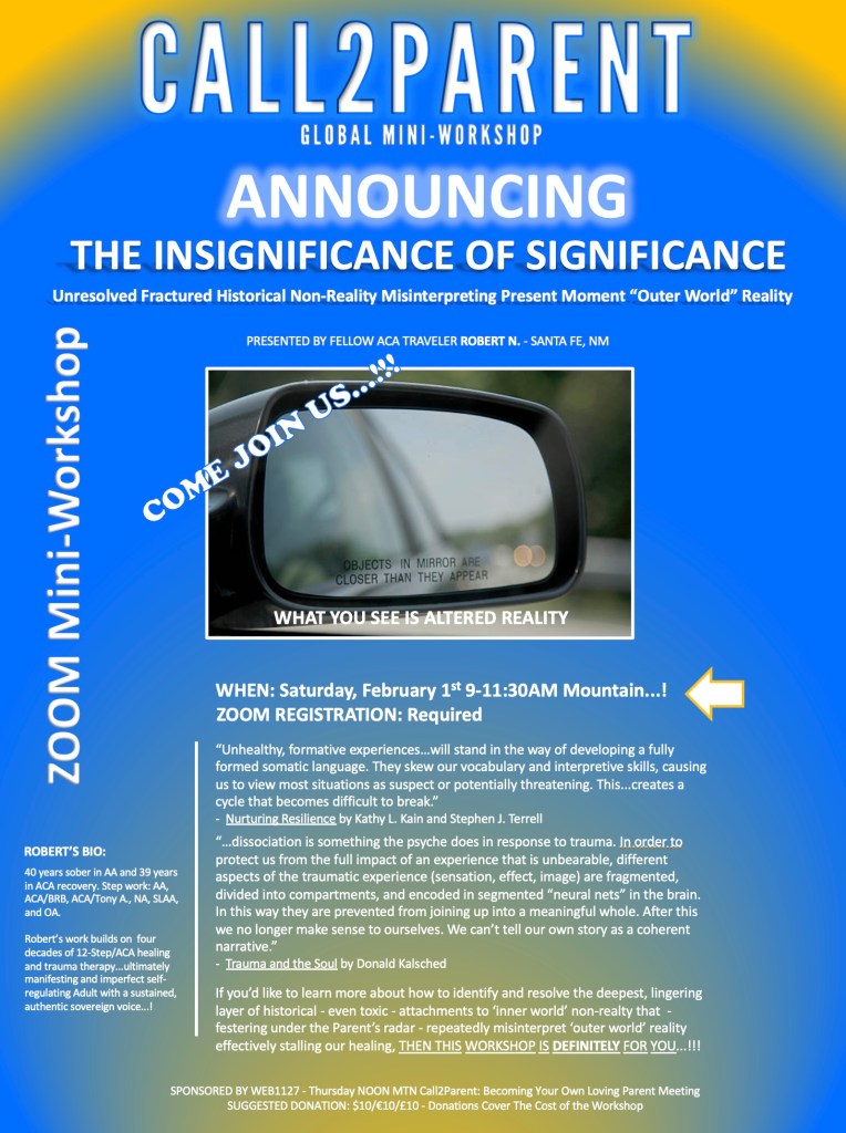 If you’d like to learn more about how to identify and resolve the deepest, lingering layer of historical – even toxic – attachments to ‘inner world’ non-realty that – festering under the Parent’s radar – repeatedly misinterpret ‘outer world’ reality effectively stalling our healing, THEN THIS WORKSHOP IS DEFINITELY FOR YOU…!!!