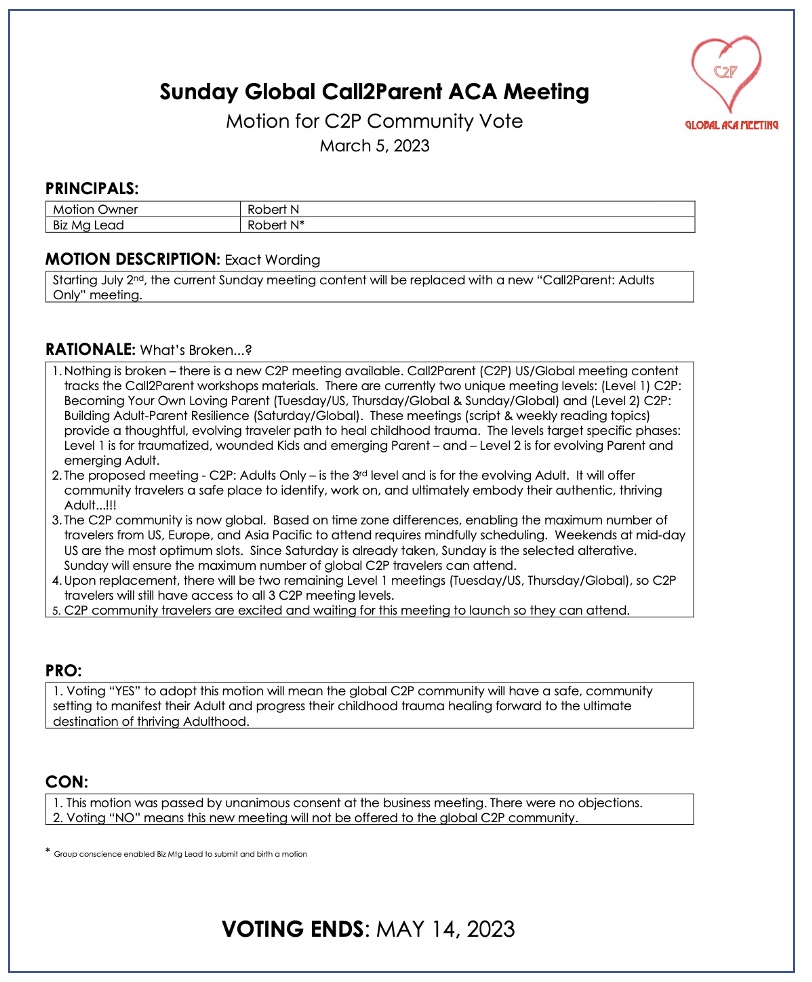 The voting for the community motion to – starting July 2nd – replace the current Call2Parent: Becoming Your Own Loving Parent content with the Call2Parent: Adults Only content has PASSED…!!! Starting Sunday July 2nd, the Call2Parent: Adults Only meeting will launch…! Here are the voting results:
