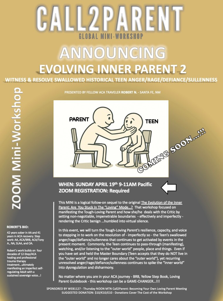This MINI is a logical follow-on sequel to the original The Evolution of the Inner Parent: Are You Stuck In The “Loving” Mode…? That workshop focused on manifesting the Tough-Loving Parent and how she/he deals with the Critic by setting non-negotiable, impenetrable boundaries – effectively and imperfectly – rendering the Critic benign…humbled into virtual silence.