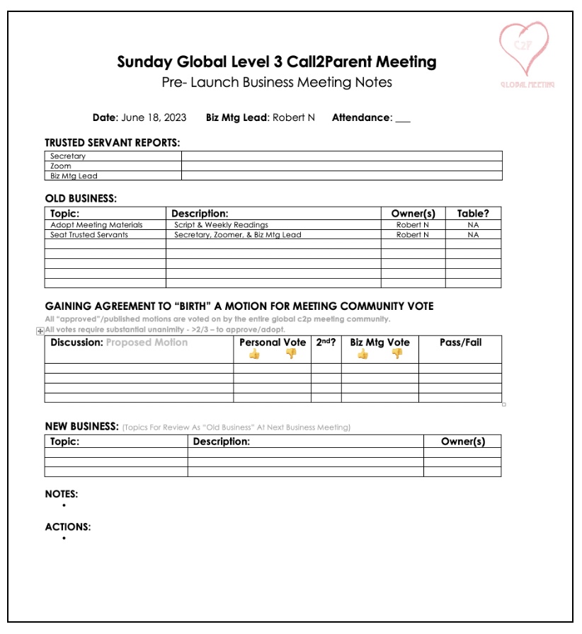 We are only replacing the meeting content. Previuosly adopted C2P business meeting process, principles, and notes document remain in place “as is”.